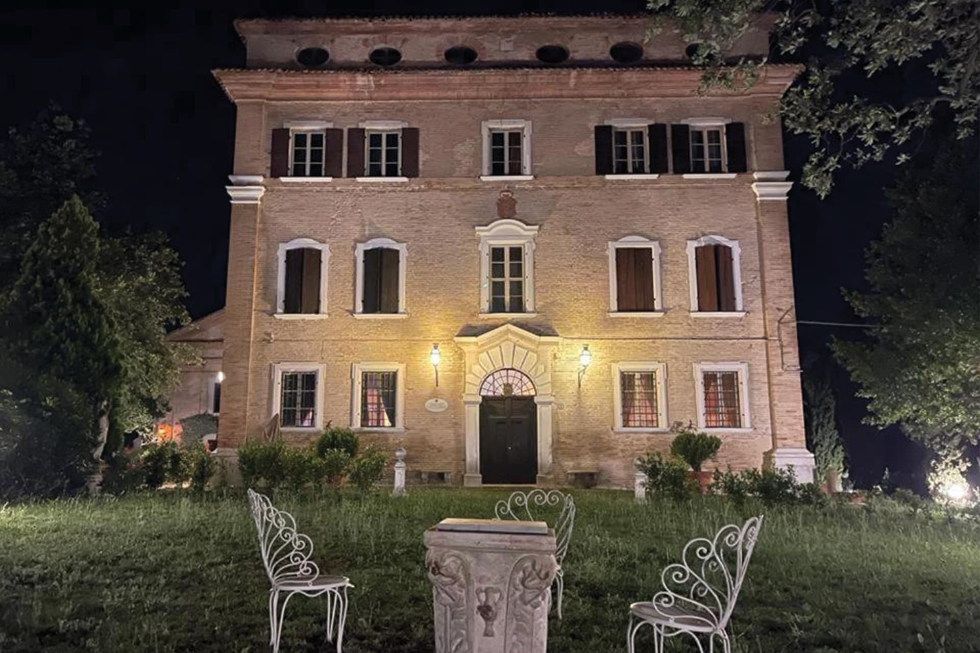 L’edificio si sviluppa su cinque piani e conserva al piano terra alcune delle stanze più suggestive, come la Sala delle Armi, il Salone delle Aquile e la raffinata Sala degli Specchi. Il piano nobile, che può essere visitato su prenotazione, è decorato da una serie di affreschi realizzati dal pittore Felice Giani, che si ispirò ai motivi ornamentali della Domus Aurea di Roma. La dimora ha ospitato nel corso dei secoli importanti figure storiche, tra cui Leonardo Antonelli, Segretario di Stato di Pio VII, e il cardinale Giacomo Antonelli, noto come il “Richelieu italiano” per il suo ruolo di spicco nella politica dello Stato Pontificio. Il palazzo divenne anche sede di importanti incontri diplomatici tra le corti europee.